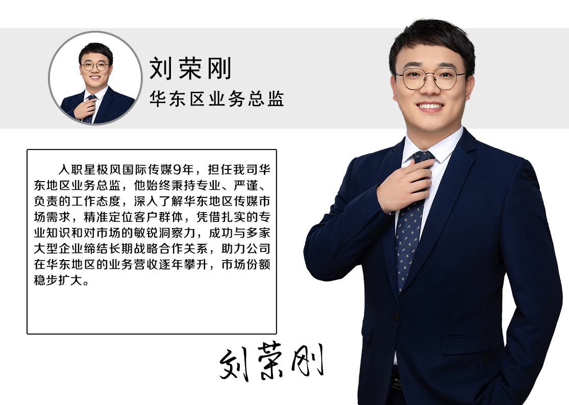 入職星極風國際傳媒9年,擔任我司華東地區業務總監,他始終秉持專業、嚴謹、負責的工作態度,深入了解華東地區傳媒市場需求,精準定位客戶群體,憑借紮實的專業知識和對市場的敏銳洞察力,成功與多家大型企業締結長期戰略合作關系,助力公司在華東地區的業務營收逐年攀升,市場份額穩步擴大。